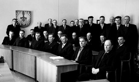 Närpes kommunfullmäktige från år 1959 har samlats på bild. online