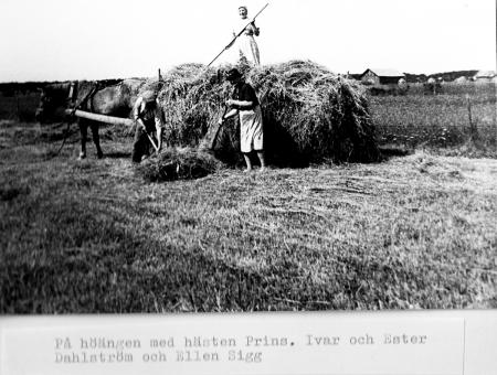 På höängen med hästen Prins. Ivar och Ester Dahlström och Ellen Sigg. online