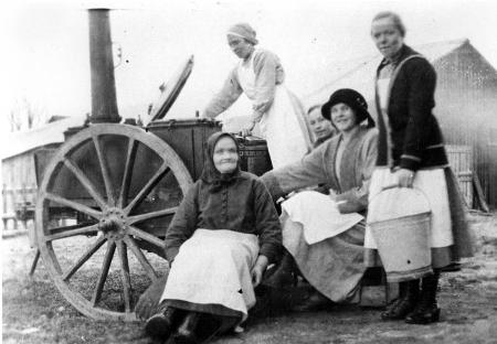 Damer från Pjelax lottor kokar soppa i ett fältkök i Pjelax. Dagmar Ellfolk rör i grytan, Karolina Danielsson, Hilma Råtts, Enni Roth-Björk, och Jenny Danielsson-Råtts ser på fotografen. online