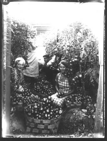 Tomatskörd i Karlsen Alefs växthus i slutet av 1930-talet. Fr.v. Inga Hummelgård (gift Snickars), Augusta Sjögård (g. Karlsén), Mikael Stark, Alef Karlsén, Anna Gullans (g. Kronqvist). online