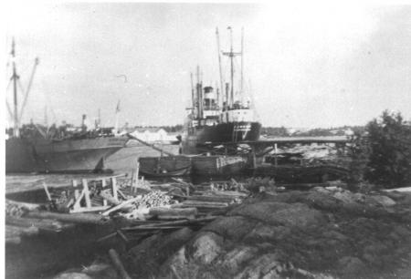 Skönvik såg i Nämpnäs. En del fartyg angjorda vid bryggan för utförsel av sågat virke. online